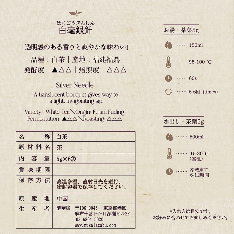 放置と乾燥という極めてシンプルな製法で作られる白茶類。白い産毛(白毫)に覆われた芽のみで作られる、白茶の中でも最高級品。淡く澄んだ茶湯にやさしい甘みと清涼感が広がる、上品でやさしい味わいです。カテキンやポリフェノールを含め免疫系を強める抗酸化物質が豊富に含まれ熱をとる効能もあるこのお茶葉、体にやさしいひとときを求める方にもおすすめです。