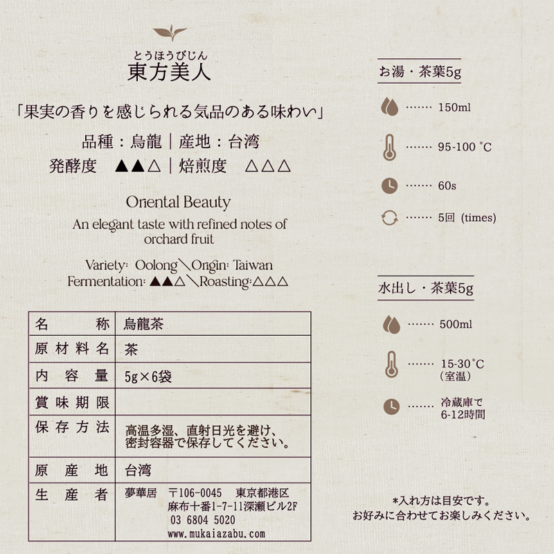 通称ウンカという虫に吸汁された茶葉をしようすることが「東方美人」を名乗るための最大条件で、独自の製法で仕上げた烏龍茶は、紅茶に近い渋みはなく、甘くさわやかな味わいが特徴。天然の蜜香と熟した果実の香りが重なり、蜂蜜や桃、花のような豊かな香りがふんわりと広がります。